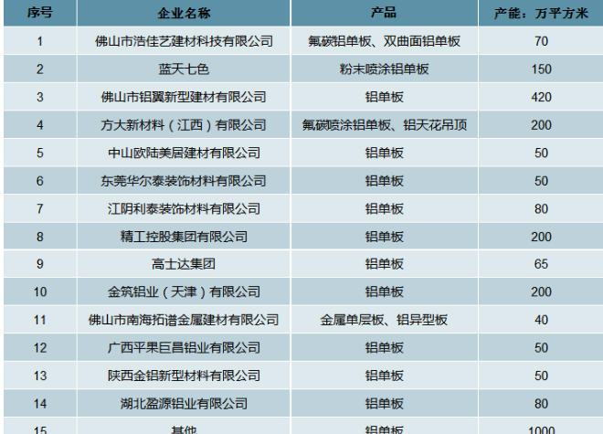 鋁單板是指經過鉻化等處理后,再采用氟碳噴涂技術,加工形成的建筑裝飾材料。氟碳涂料主要是指聚偏氟乙烯樹脂(KANAR500),分底漆、面漆、清漆三種。目前,我國鋁單板行業生產企業數量較多,鋁單板行業企業數量已經超過1000家,大多少企業產能小于50萬平方米/年。2019年我國鋁單板行業產能約2705萬平方米。